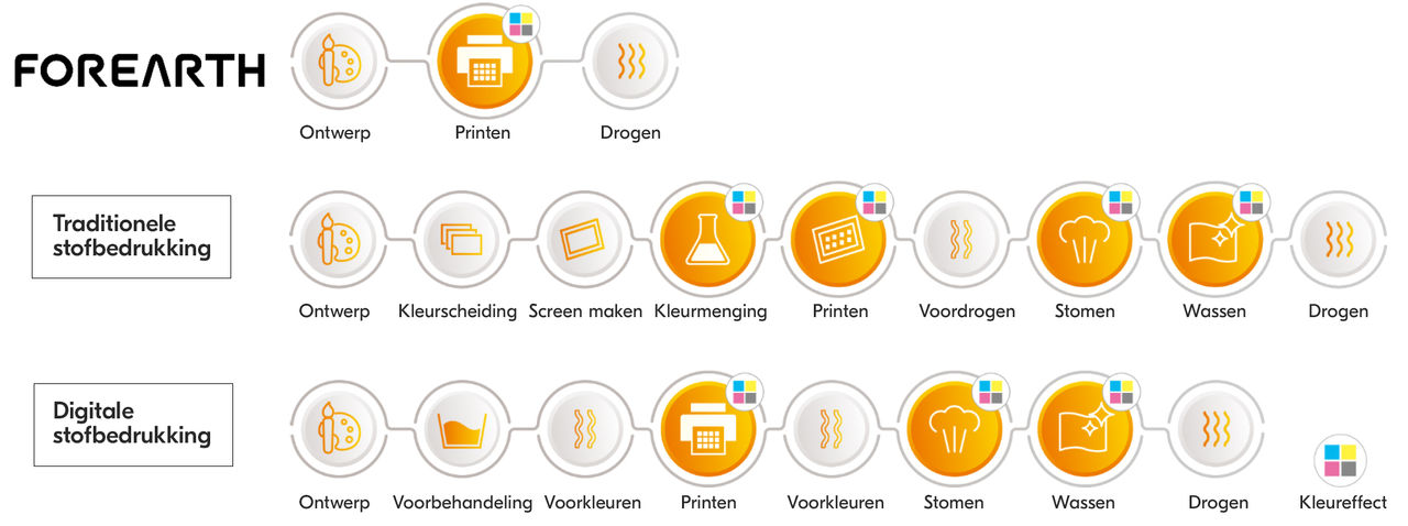 FOREARTH verkort drastisch het aantal processen van ontwerp tot productie. Er zijn geen aparte faciliteiten nodig voor de voor- en nabewerkingsprocessen die bij conventioneel textieldrukken vereist zijn.